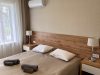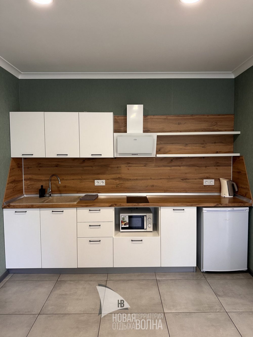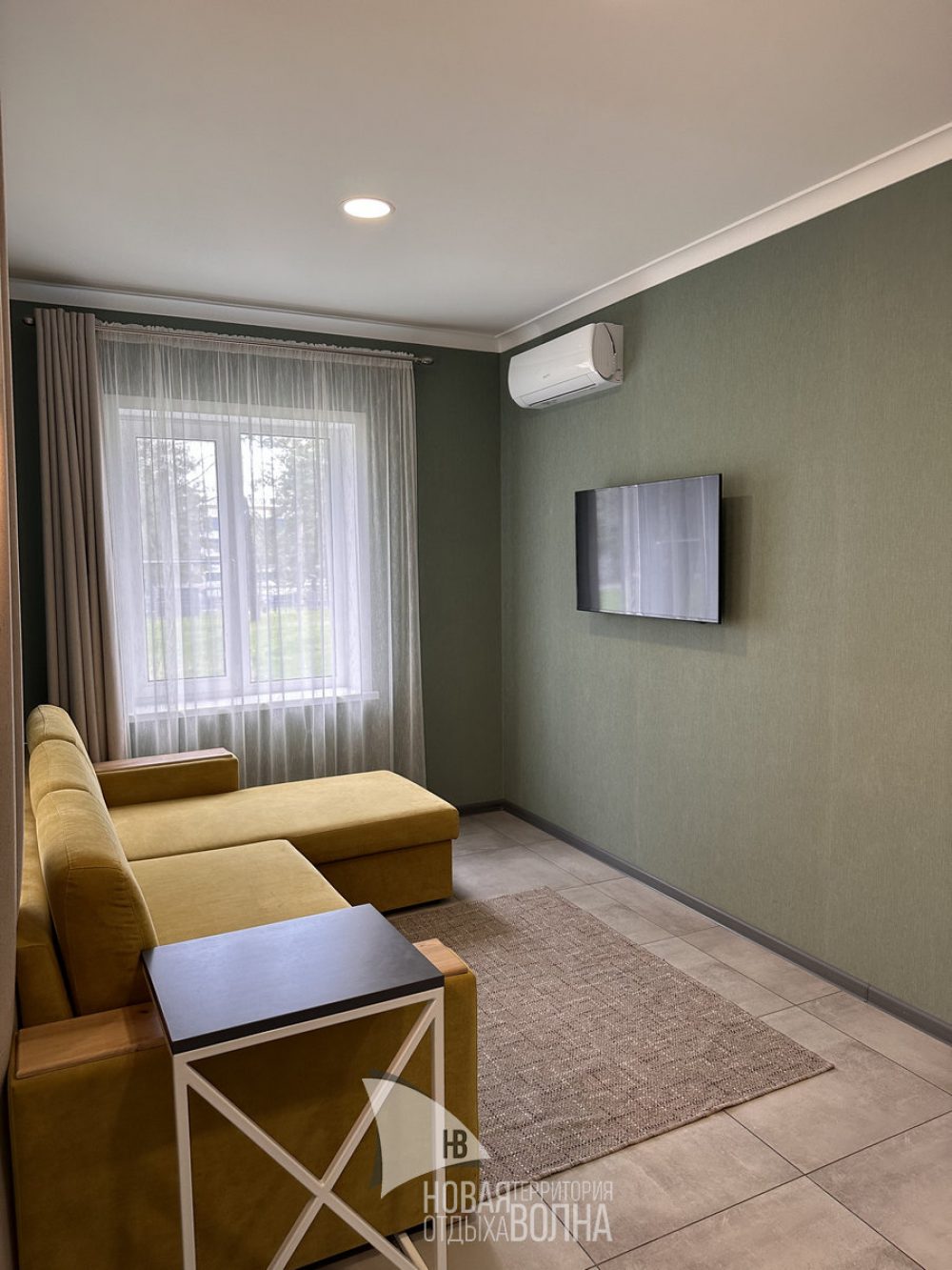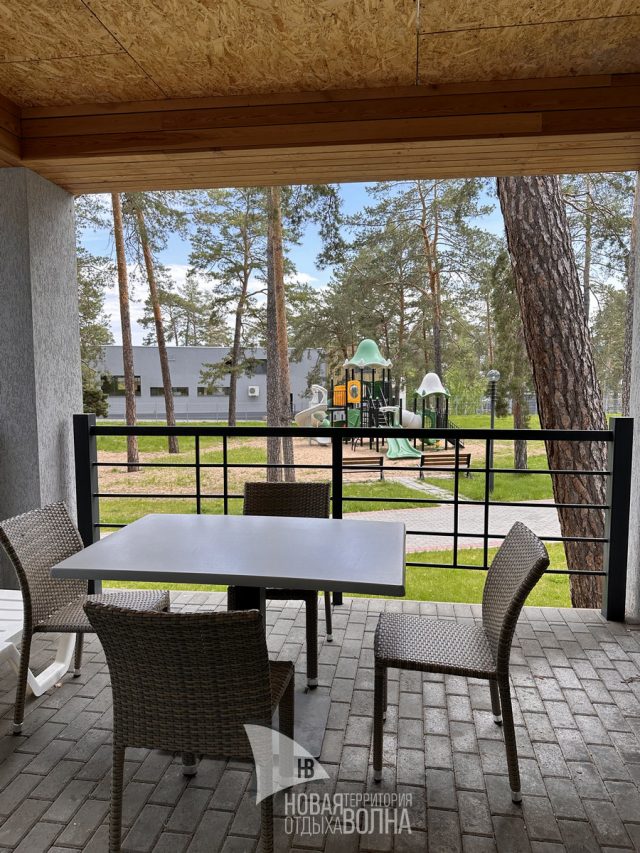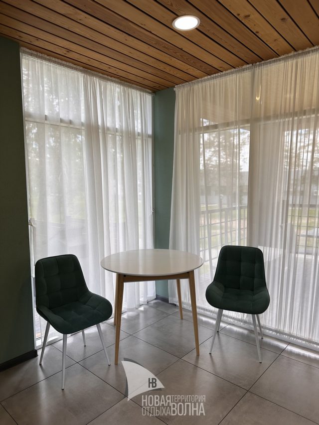 Входная группа с панорамными окнами, обеденным столом. Гостиная с тёплыми полами и полностью оборудованной кухонной зоной (холодильник, микроволновая печь, стеклокерамическая плита, чайник, набор посуды на 4 персоны, кастрюля, сковорода, шампура). Гостиная оснащена телевизором, кондиционером и мягкой зоной для отдыха. Уютная спальня с большой кроватью и кондиционером. Санузел.