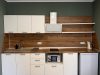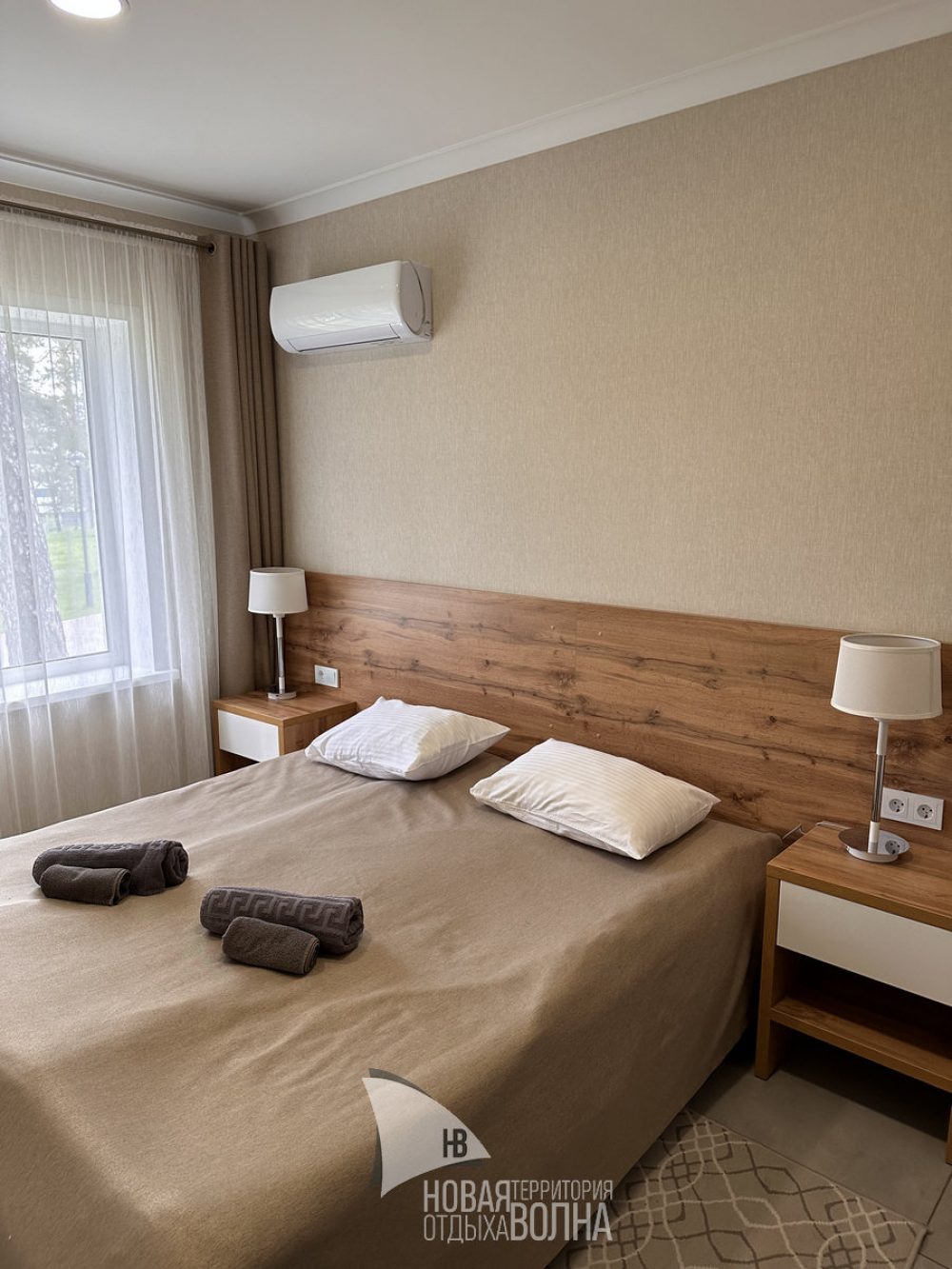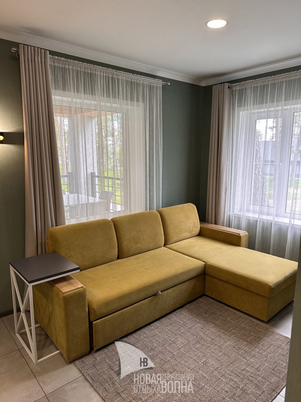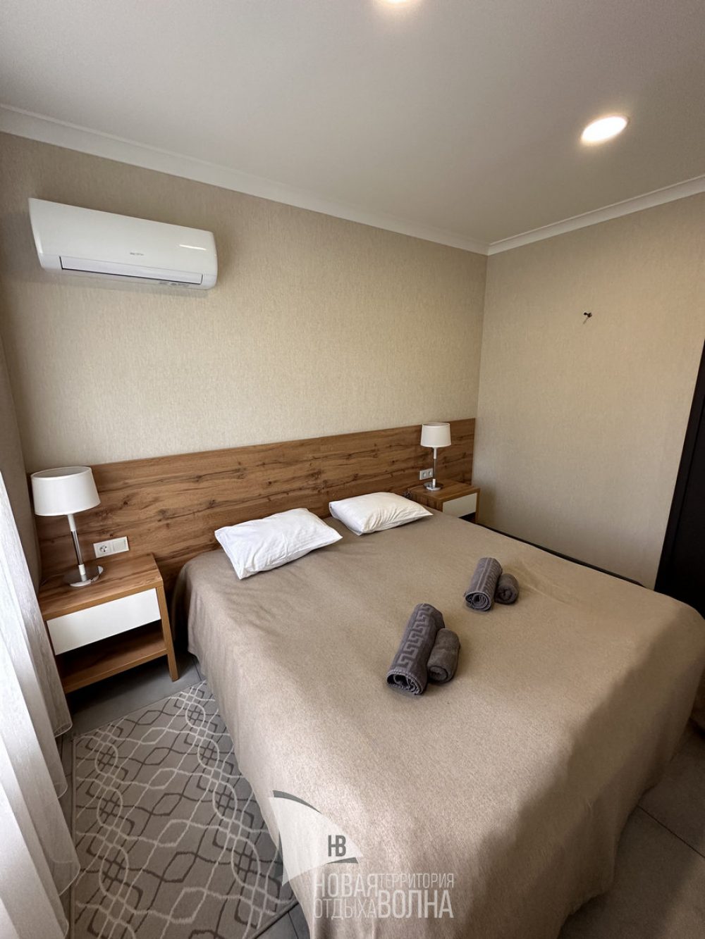 Входная группа с панорамными окнами, обеденным столом. Гостиная с тёплыми полами и полностью оборудованной кухонной зоной (холодильник, микроволновая печь, стеклокерамическая плита, чайник, набор посуды на 4 персоны, кастрюля, сковорода, шампура). Гостиная оснащена телевизором, кондиционером и мягкой зоной для отдыха. Уютная спальня с большой кроватью и кондиционером. Санузел.